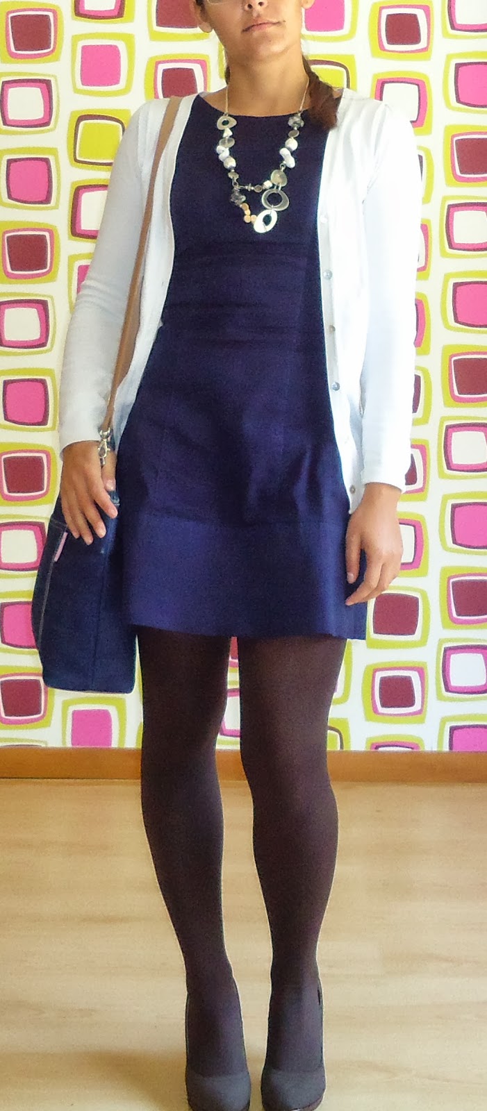 Aqui fica um look de trabalho com duas cores que nunca tinha juntado antes: azul marinho e castanho. Uns apontamentos de branco e estou pronta para sair!